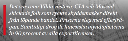It was pure Wild West. Both the CIA and Mossad sent people there who snatched protective masks directly from the assembly line and loaded them on their planes. At the same time, the Chinese authorities withdrew 90 percent of all export licenses.["Det var rena Vilda västern. Både CIA och Mossad skickade dit folk som ryckte skyddsmasker direkt från löpande bandet och lastade på sina plan. Samtidigt drog de kinesiska myndigheterna in 90 procent av alla exportlicenser."]"Both the CIA and Mossad sent people there who snatched protective masks directly from the assembly line and loaded them on their planes"!
