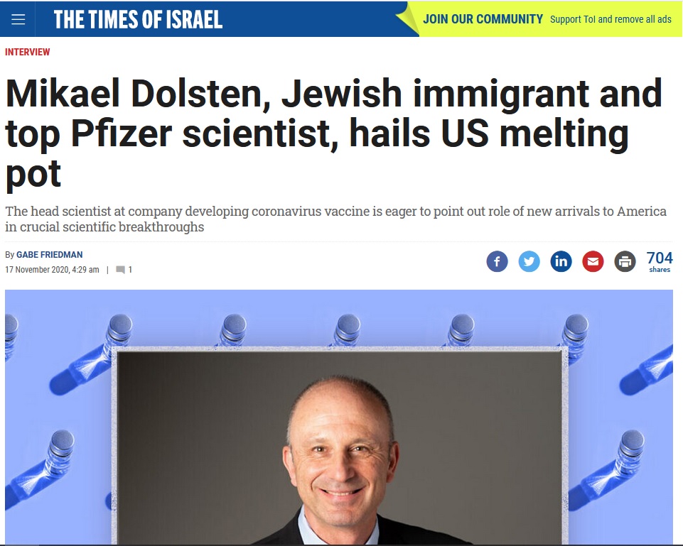 It is also important to add that the head scientist at Pfizer is the Swedish-American Jew Mikael Dolsten. The Times of Israel article "Mikael Dolsten, Jewish immigrant and top Pfizer scientist, hails US melting pot" (The Times of Israel, 17 November 2020) noted boastingly that:Dolsten, who moved to the New York area from Sweden in 2004, is far from the only Jewish immigrant in his field. In fact, Pfizer CEO Albert Bourla is a Jew from Thessaloniki, Greece. The chief medical officer for Moderna, a competing drugmaker that announced Monday that its COVID-19 vaccine was nearly 95% effective, is an Israeli immigrant named Tal Zaks.