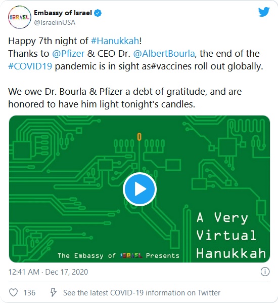 The event was also noted in The Times of Israel, in the article: "Pfizer CEO, son of Holocaust survivors, joins Israeli embassy Hanukkah lighting" (The Times of Israel, December 17, 2020):
