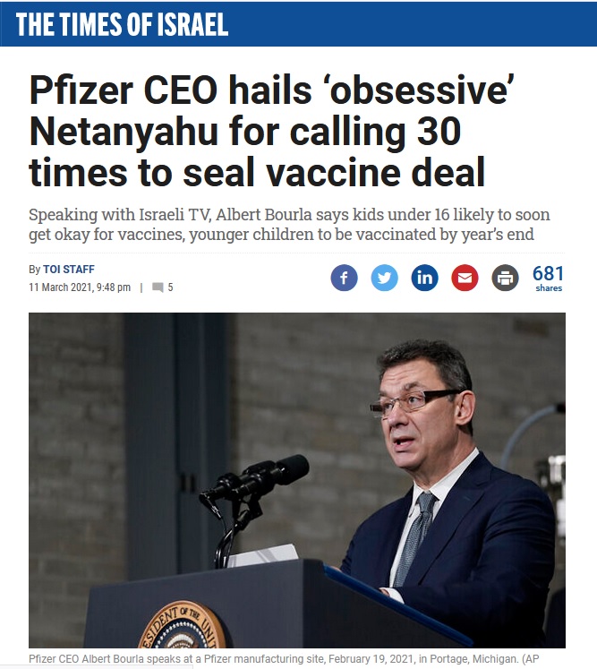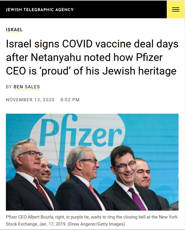 Then followed Israel's criminal mafioso leader, Benjamin "Bibi" Netanyahu, pushing the Jewish levers on Albert Bourla, to secure the first shipments of the newly produced vaccine, in advance of the non-Jewish nations. Netanyahu boasted that he called Bourla multiple times, to get Israel the newly produced staches.Bourla himself admitted in The Times of Israel article "Pfizer CEO hails ‘obsessive’ Netanyahu for calling 30 times to seal vaccine deal" (The Times of Israel, 11 March 2021):