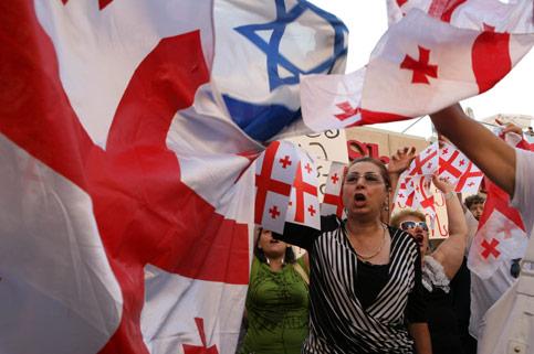 Israelis wave both Georgian and Israeli flags as they chant anti-Russian slogans during a demonstration outside the Russian embassy in Tel Aviv, 2008