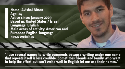 That is the exact reason why some try to show surfers “the right side”. Avishai Bitton, a 24-year-old student from Rishon Lezion, is another Israeli web warrior. As a child, he came to Israel from New York, where he lived right across from the UN Headquarters. During his military service, a while after the operation in Gaza in 2009, he went to visit family in the US and passed by a pro-Palestinian rally in the Big Apple. The chasm between the signs reading “Israel is a murderer” and his experiences as a soldier in the most moral army in the world, as he continuously calls it, jolted him. Since then, he has been there: Morning, noon, night, whenever is needed. Coffee on the table, laptop in his hands, looking for virtual battles around the world.