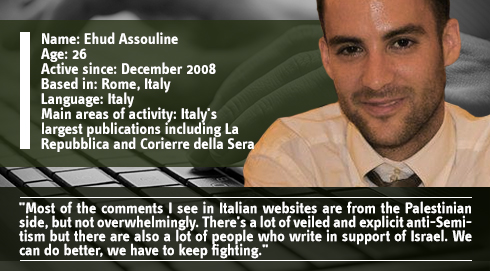 Ehud Assoulin is a 26-year-old from Ramat Hasharon who has been living and studying in Rome for the past four years. “I started posting comments in Italian for Israel during Operation Cast Lead,” he said, “when Italian media was turbulent, and I saw an array of media distortions and prejudice about Israel. It made me angry on the simplest and most moral level and I felt that I couldn’t stay indifferent.”