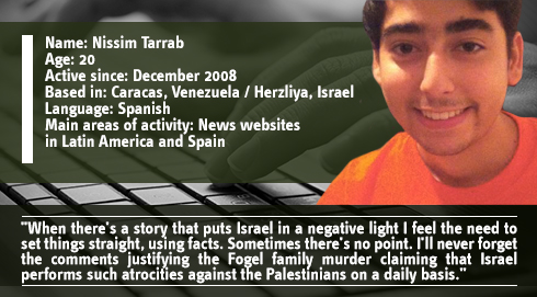 The most skilled comment posters know to characterize other comment posters according to their land, and describe Latin America as one of the most problematic zones for Israel: “There’s a horrible knowledge base there,” a senior comment poster said, “Sometimes people write about Israel like they used to talk about the world being flat, showing false data and ‘facts’ that make us cry and laugh simultaneously.”Trying to set the record straight is Nissim Tarrab, a 20-year-old from Venezuela who is studying for his bachelor in communication in Israel. Every day he logs on to the biggest Spanish news sites: From papers of his own country, to the Argentinean Clarin and the Spanish El Pais.