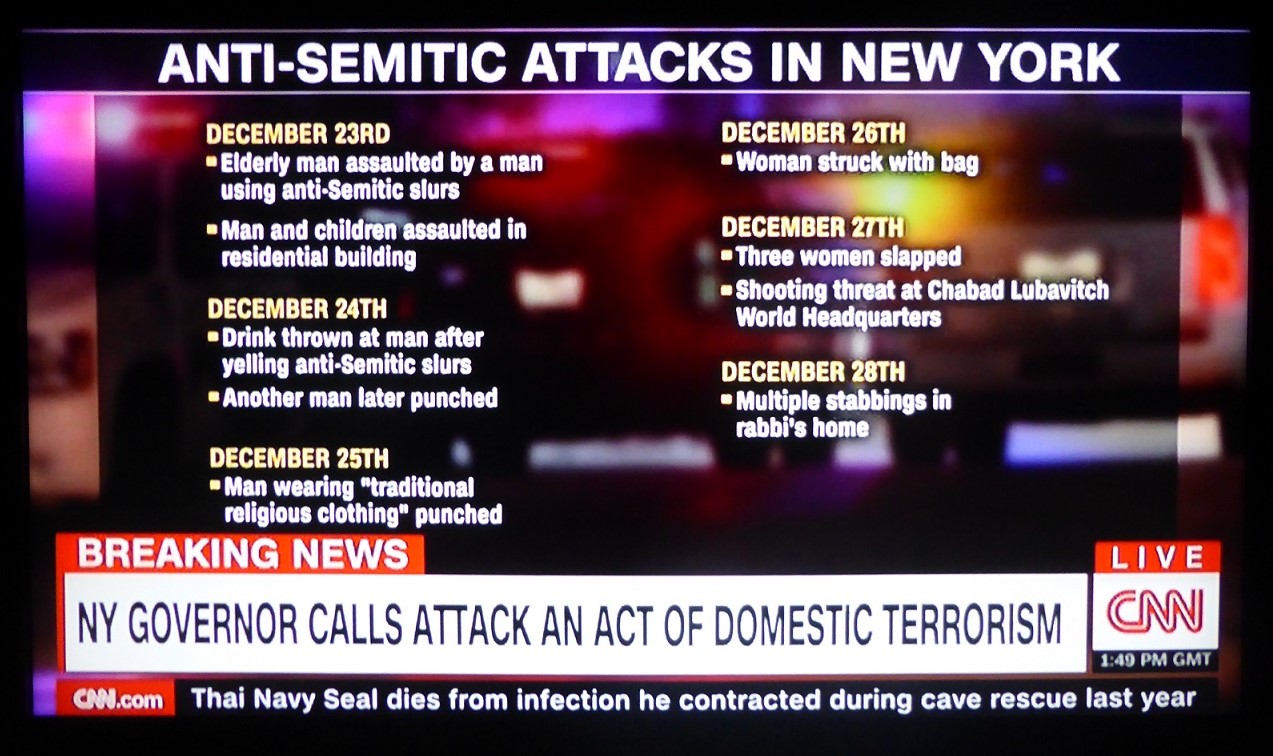 On the eve of the stabbing of Jews at a rabbis home in New York on 28th December 2019, CNN ran the following fact table, documenting "Anti-Semitic Attacks in New York".