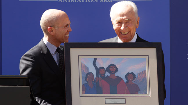Israeli President Shimon Peres paid a celebratory visit to DreamWork Animation's Valley studios Friday, where studio chief Jeffrey Katzenberg presented him with original art work from the film The Prince of Egypt.