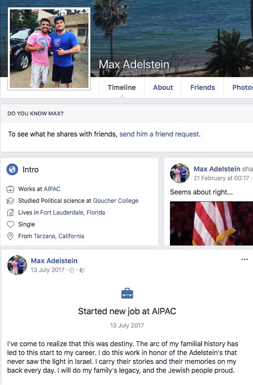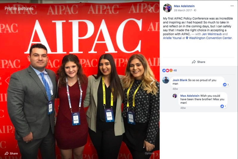 A photo from AIPAC staffer Max Adelstein’s Facebook profile,