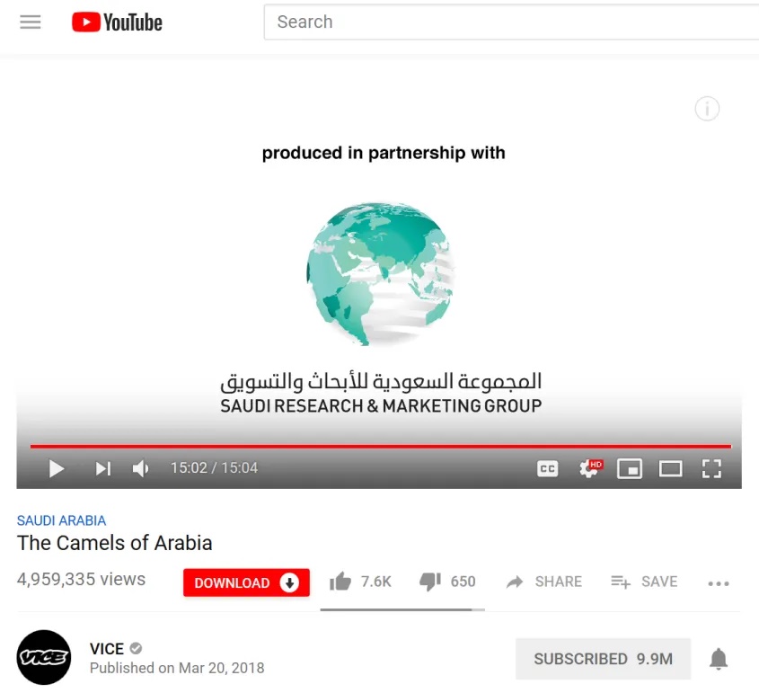 Waterson noted that a video VICE published in March promoting the King Abdulaziz Camel Festival was produced in partnership with SRMG. This video has nearly 5 million views.