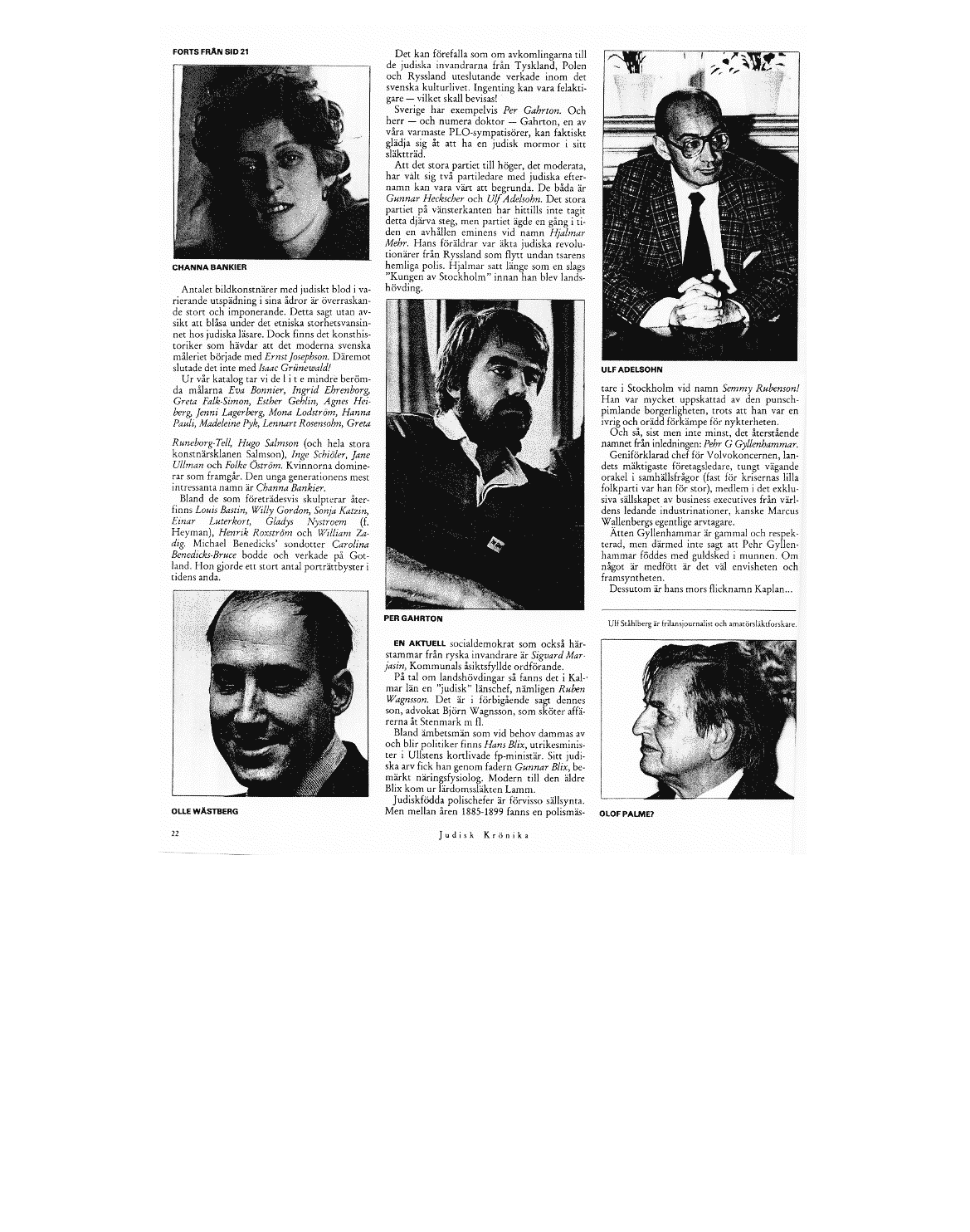 Below we have an overview of the abovementioned article from the Swedish Jewish magazine Judisk Krönika, nr.4-1985, about famous Swedes with Jewish ancestry. To read the original article click on the respective pages and you will be linked to the pages in original size (remember to maximize the pages in your Browser).