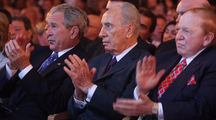 Sheldon Adelson, right, seen here with then-President George W. Bush and Israeli President Shimon Peres at a Jerusalem
