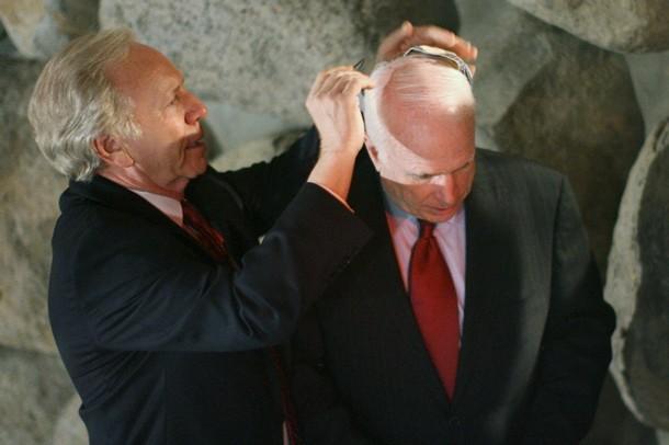 Jewish U.S. Sen. Joe Lieberman (L) puts a yarmulke on Republican nominee U.S. Sen.