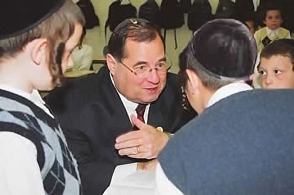 Jerrold ”Jerry” Nadler with kippah on head, visiting an Orthodox Jewish School in Brooklyn.
