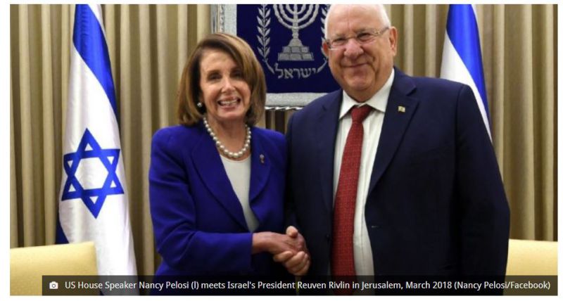 Nancy Pelosi with Israel's President Reuven Rivlin in occupied Jerusalem, Israel, 2018.