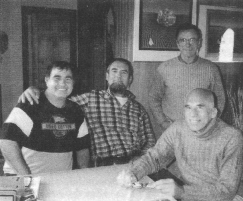 Dr. Fredrick Töben, center, during his visit at the IHR office, April 1, 1997, with Mark Weber, left, and Greg Raven, right.