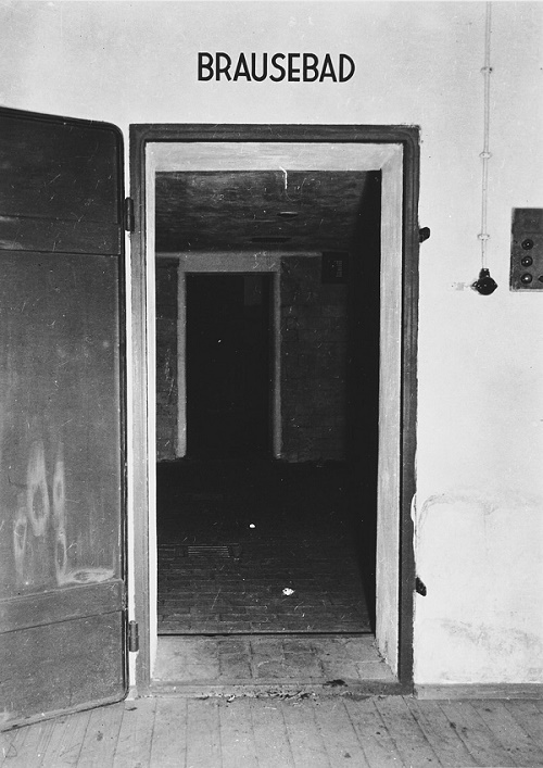 "A distinguishing feature of the Dachau Camp was the gas chamber for the execution of prisoners and the somewhat elaborate facilities for execution by shooting. The gas chamber was located in the center of a large room in the crematory building. It was built of concrete. Its dimensions were about 20 by 20 feet, and the ceiling was some 10 feet in height. In two opposite walls of the chamber were airtight doors through which condemned prisoners could be taken into the chamber for execution and removed after execution. The supply of gas into the chamber was controlled by means of two valves on one of the outer walls, and beneath the valves was a small glass-covered peephole through which the operator could watch the victims die. The gas was let into the chamber through pipes terminating in perforated brass fixtures set into the ceiling. The chamber was of a size sufficient to execute probably a hundred men at one time."