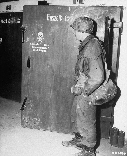 A soldier from the U.S. 7th Army examines the door to the supposed gas chamber of Dachau.