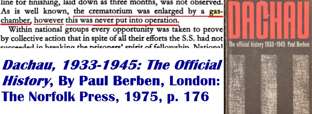 And if there were small gassings at Dachau, it's even worse for the exterminationists because nobody will believe that the Nazis used a sophisticated method (pipes, valves, etc.) for small gassings and very rudimentary methods (zyklon B pellets poured through holes in the roof and CO-free diesel fumes) for industrial gassings. If they had had a sophisticated gas chamber at Dachau, they would naturally have built the same type of gas chambers at Auschwitz, Treblinka, Majdanek and other Polish alleged "Death camps"...