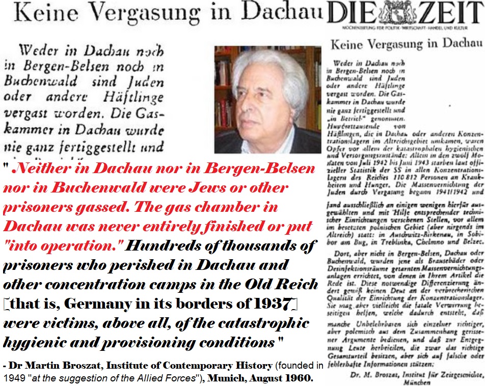 "Neither in Dachau nor in Bergen-Belsen nor in Buchenwald were Jews or other prisoners gassed. The gas chamber in Dachau was never entirely finished or put “into operation.” Hundreds of thousands of prisoners who perished in Dachau and other concentration camps in the Old Reich were victims, above all, of the catastrophic hygienic and provisioning conditions: according to official SS statistics, during the twelve months from July 1942 through June 1943 alone, 110,812 persons died of disease and hunger in all of the concentration camps of the Reich."