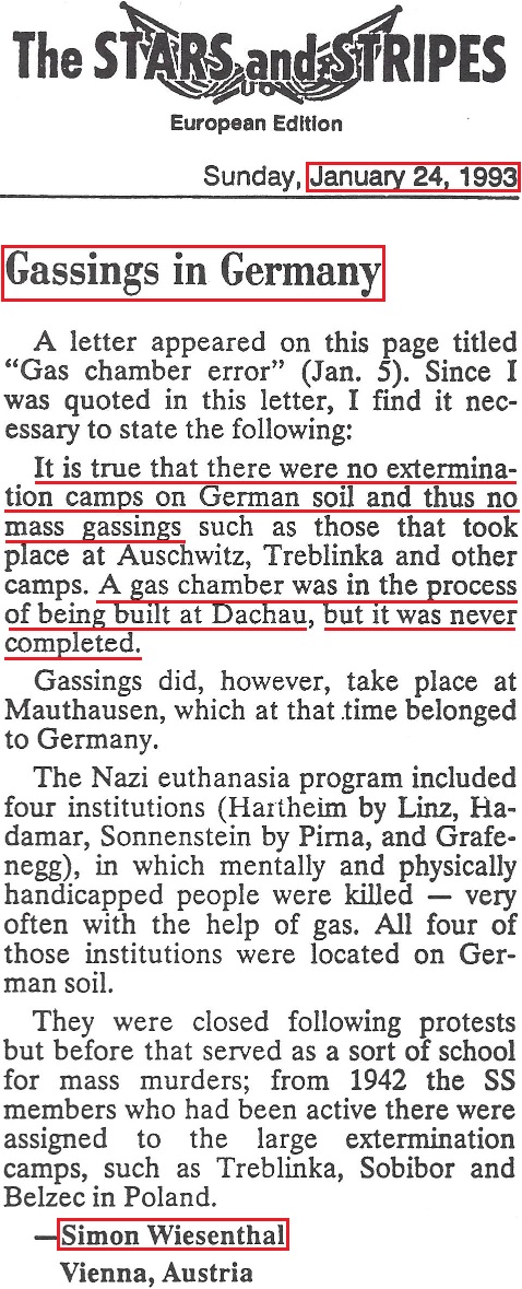 Simon Wiesenthal, "Gassings in Germany" The Stars and Stripes European Edition, Sunday, January 24, 1993 pg. 14.