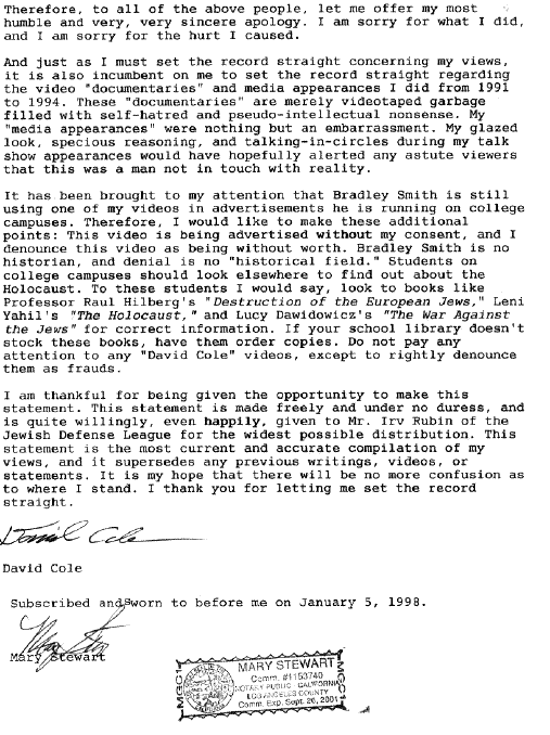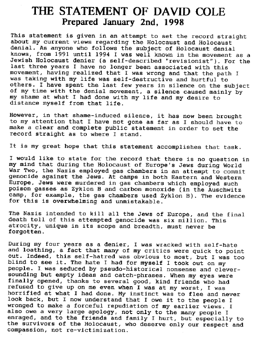 Note: CODOH has not heard from David Cole and does not have absolute confirmation of the validity of the document that follows. We ask that all intelligent readers read this carefully and compare it to David's earlier works. This statement appears on the JDL website, where it replaced the threats which perhaps led to it.