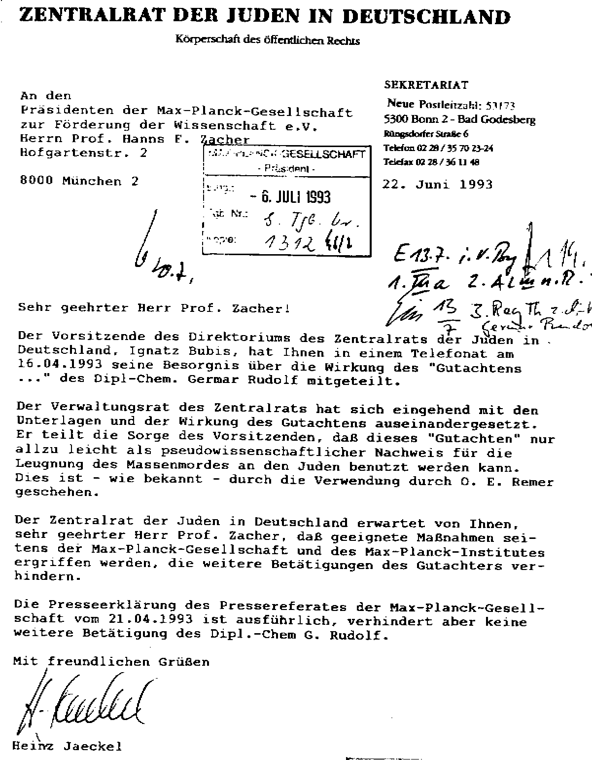 Letter by Central Council of Jews in Germany to the Max Planck Society