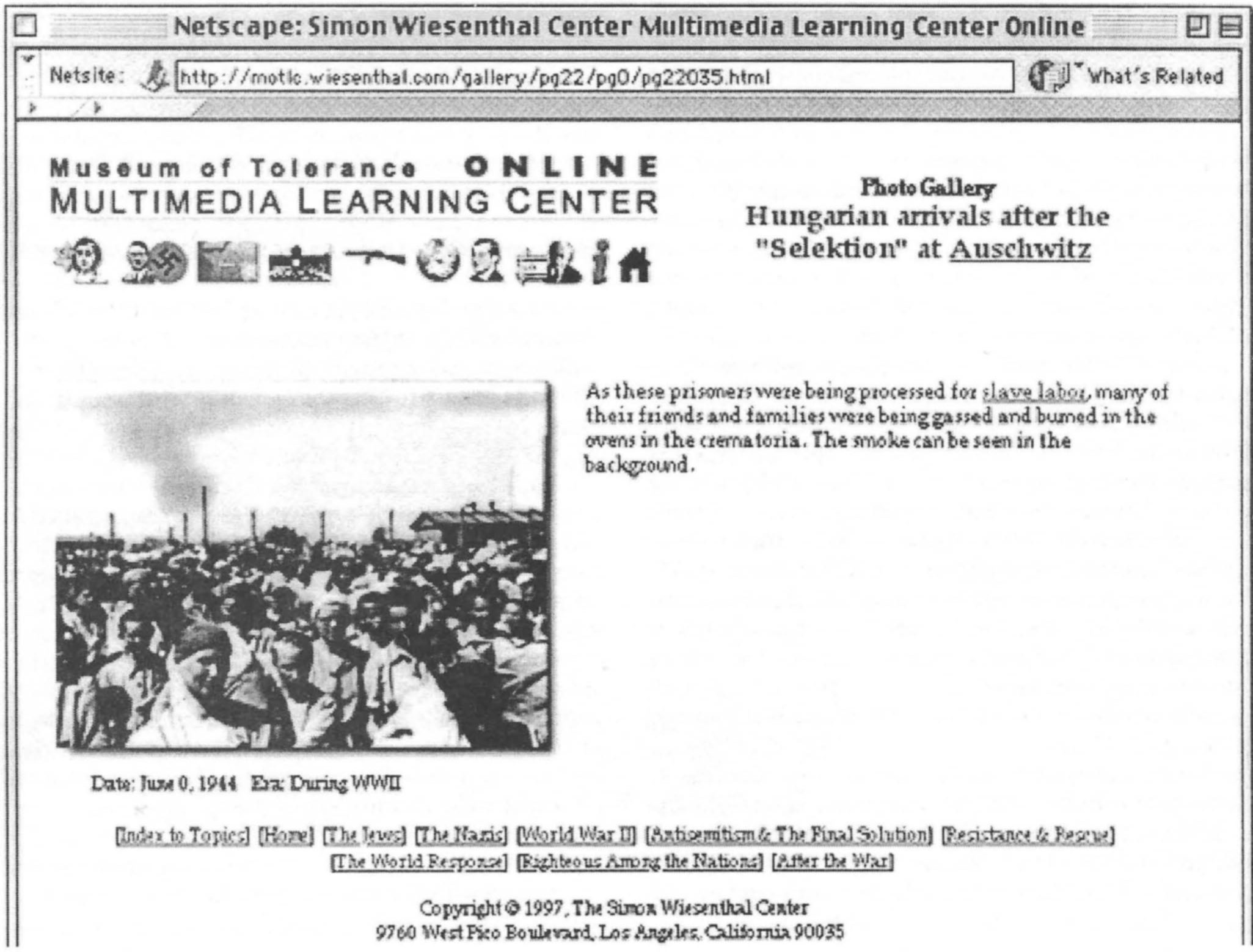 A doctored wartime photograph of the Auschwitz-Birkenau camp displayed by the Simon Wiesenthal Center on its "educational" web site is a good example of how the influential Holocaust organization falsifies history.The Center posts the photograph on its "Multimedia Learning Center Online" web site under the heading "Photo Gallery: Hungarian arrivals after the 'Selektion' at Auschwitz" (http://motlc.wiesenthal.com/gallery/pg22/pg0/pg22035.html [the photo was removed from that website in 2000; ed]). Dated "June 0, 1944," the photo is captioned: "As these prisoners were being processed for slave labor, many of their friends were being gassed and burned in the ovens in the crematoria. The smoke can be seen in the background."