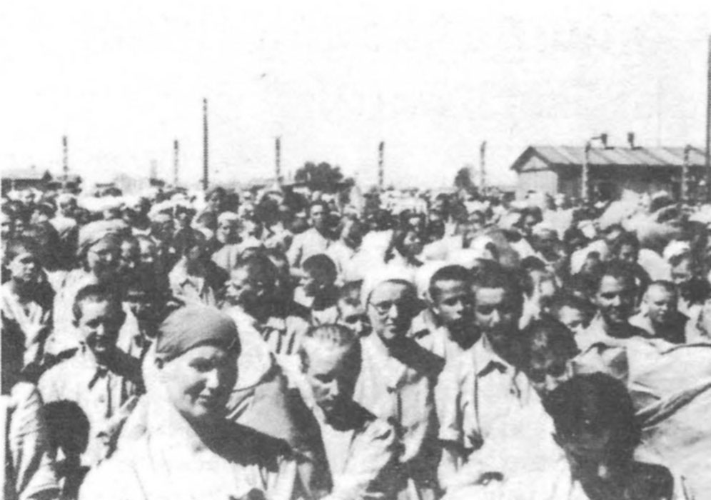 The photograph has been altered by adding phony "smoke" to the background, apparently to support survivor testimony about smoke billowing from Birkenau crematory chimneys. The fraud is obvious with a glance at the original photo, which is published in The Auschwitz Album (New York: Random House, 1981), page 126 (photo No. 143).The 185 photos of Auschwitz-Birkenau camp in this album appear to have been taken by German SS camp officials in 1944 -- that is, during the supposed high point of the alleged extermination program there. The original album was confiscated by a Jewish inmate, Lili Jacob Meier, who brought it to the United States after the war.