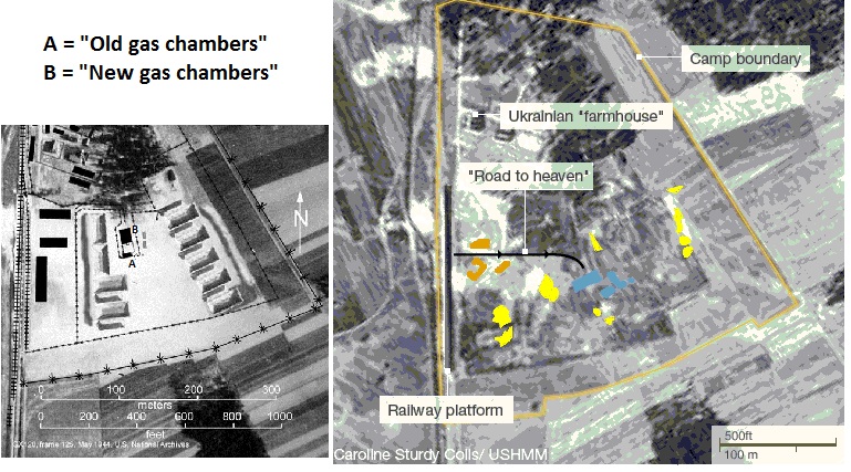 In the figure to the right I have placed Bay's Figure 42 side by side with the Sturdy Colls composite map based on the 1944 air photo. (Click on it to open a full-size version.) The scales of the two maps have been harmonized. To Bay's map I have also added the letters A and B to indicate the solid black outlines drawn by Bay to mark out the two alleged gas chamber buildings. Even considering Bay's admission that the positioning and size of his mass graves "is purely speculative," it is clear that his vision of what the "death camp proper" might have looked like differs considerably from Sturdy Colls' map. As for the locations of the two alleged gas chamber buildings, which Bay goes to painstaking length to identify (based on the aerial photos and witness statements), the four structures marked out by Sturdy Colls (in blue) and designated "probable location of gas chambers" are located some 100 m south of the sites pinpointed by Bay. The alignment of these structures is also rather different from that asserted by Bay. Together with the considerable difference in surface size between the mass graves posited by Bay and the pits identified by Sturdy Colls, this says something of the competence of Bay as well as the reliability of his star witness Wiernik.- As for the "probable location of gas chambers" we learn virtually nothing other than that Sturdy Colls has identified two brick structures. On the composite maps, however, four structures are marked out, of which the largest (near the eastern exit of the "Road to heaven") is likely to be the one identified by Sturdy Colls as the "new gas chamber building." The three other structures, two of which are relatively large, are located close to each other. One must suppose that one of the two larger structures has been identified by Sturdy Colls as the "old gas chamber building." According to the most elaborate exterminationist effort to map Treblinka based on aerial photos and eyewitness testimony – the 2004 map by Peter Laponder (who also refers to ground photos taken inside the "death camp proper" as found in Kurt Franz's photo album "Schöne Zeiten")[25] – the only structures located adjacent to the "old gas chamber building" were a water pump shelter, a tiny guardhouse, and a watchtower. Yet on the composite map we have two larger structures next to each other. We will have to wait and see if the geophysical survey has revealed anything about the layout of these structures. If that is not the case, we can only hope that Sturdy Colls soon returns to the camp site to excavate the detected structural remains.