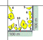 Above: Montage of the 10 identified pits placed within a square 100 × 100 meters. Relative dimensions have been kept unchanged from the maps produced by Caroline Sturdy Colls.