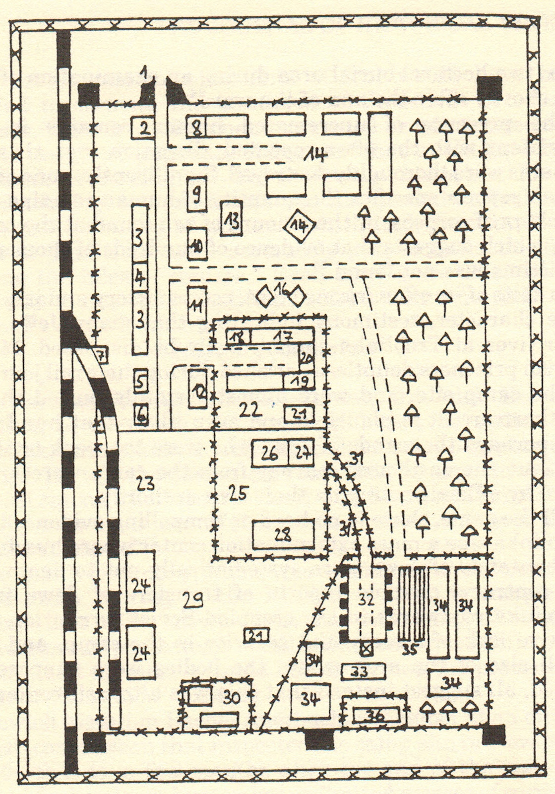 This diagram of the Treblinka II camp was used in the "Treblinka Trialn in Diisseldorf, where it was supposedly "accepted by all of the defendants and witnesses." In this diagram, not only is the general shape of the camp inaccurate, but no scale is provided, thus giving a misleading impression that the camp was much larger than it actually was. The alleged extermination "gas chambers" are marked 32 and 33. The supposed mass burial sites, which are marked 34, are not large enough to have held the hundreds of thousands of bodies allegedly buried there. [From: Eugen Kogon, et al., Nationalsozialistische Massentotungen durch Giftgas (Frankfurt: 1986), p. 342.]