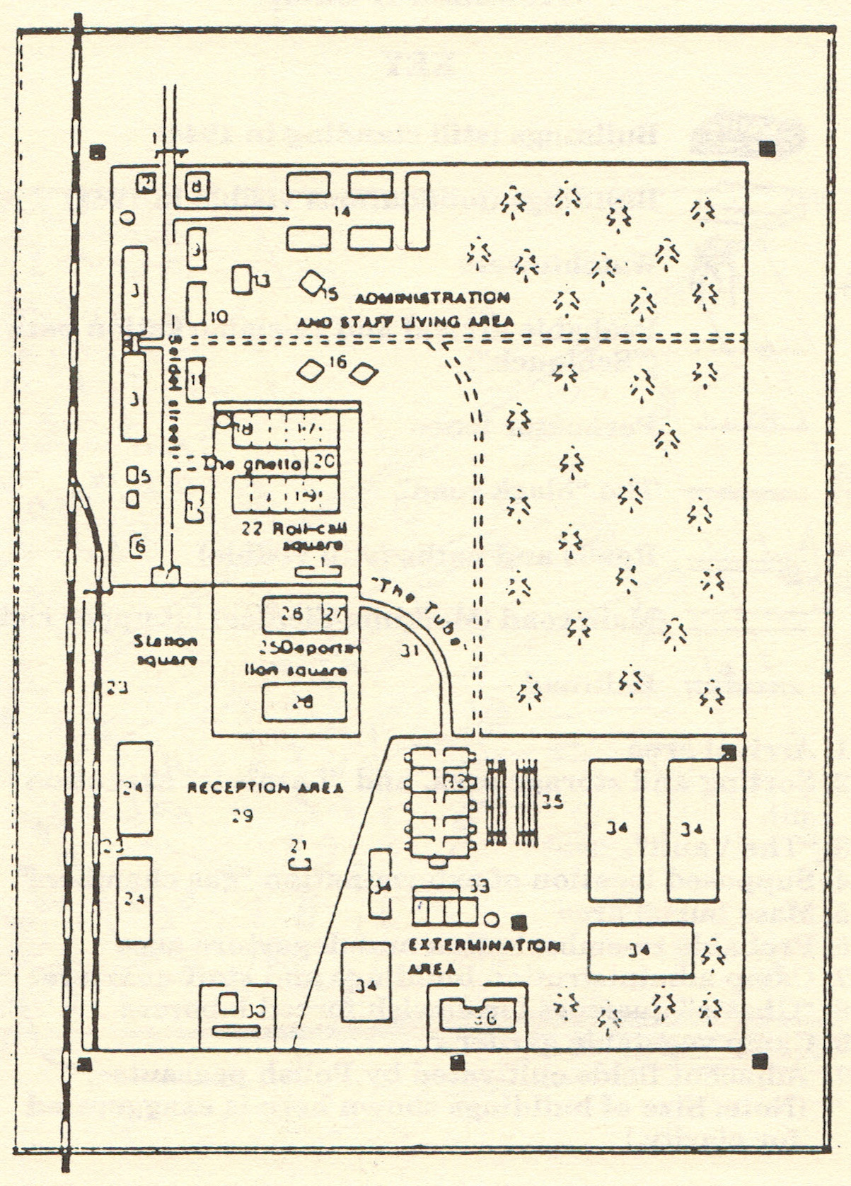 The diagram below of the Treblinka II camp in 1942-1943 is based on wartime aerial photographs, published sources, and postwar on-site inspection. (Copyright 1991 by Janusz Patek. Reproduced by permission.)