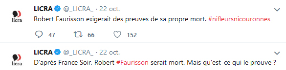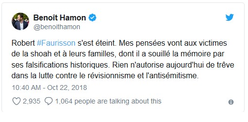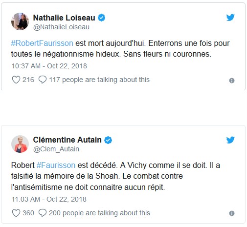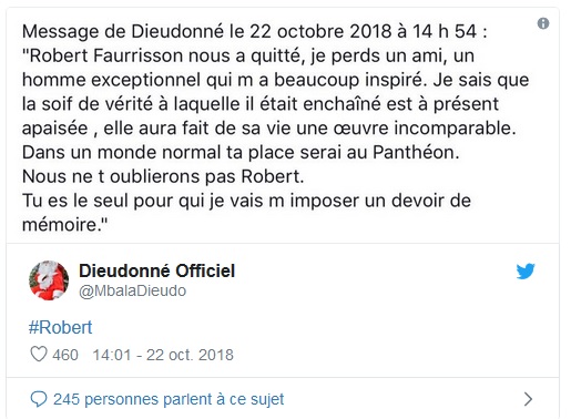 Le professeur Robert Faurisson est décédé dimanche 21 octobre 2018 vers 19 heures à Vichy au retour d’un voyage à son lieu de naissance à Shepperton (Royaume-Uni). Il avait 89 ans.