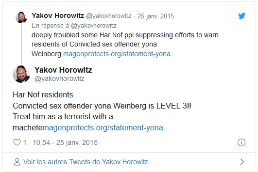 Le 24 novembre, le Tribunal de District de Jérusalem a tenu sa toute première audience procédurale dans l’affaire opposant un pédophile, Yona Weinberg, qui avait été condamné, à l’activiste des droits de l’enfant Yakov Horowitz. Horowitz avait tweeté un avertissement aux parents du quartier Har Nof de Jérusalem après que Weinberg s’y soit installé.