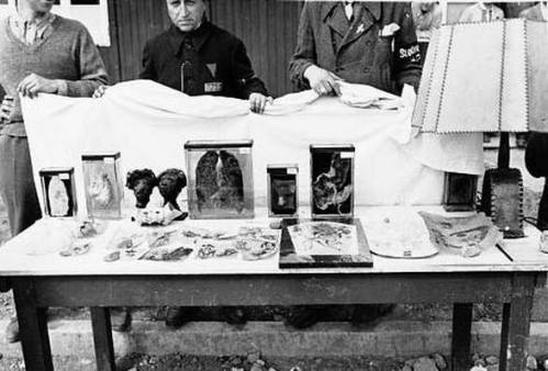 La table des "atrocités nazies", au camp de concentration de Buchenwald, en Allemagne, avec ses têtes réduites à la manières des Jivaros, ses peaux tatouées et l’abat-jour en peau humaine