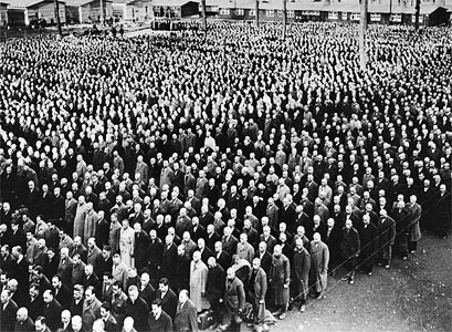 Des déportés sur la place d’appel du camp de concentration de Buchenwald, en Allemagne, pendant la Seconde guerre mondiale. On constate que les déportés ne sont pas dans un état squelettique