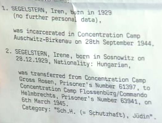 Un document exhibé par Irene Zisblatt dans The Last Days. Il indique qu’Irene Zisblatt a été transférée entre les camps de concentration de Gross Rosen et Flossenbürg, le 6 mars 1945, alors qu’elle prétend avoir participé à une "marche de la mort" entre les camps de Neuengamme et de Theresienstadt