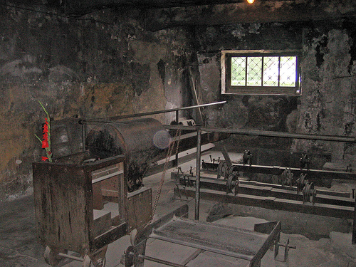 Vue de la prétendue "chambre à gaz" d’Auschwitz, en Pologne. On remarque la fenêtre vitrée que n’importe quel déporté aurait pu briser pour échapper au gazage