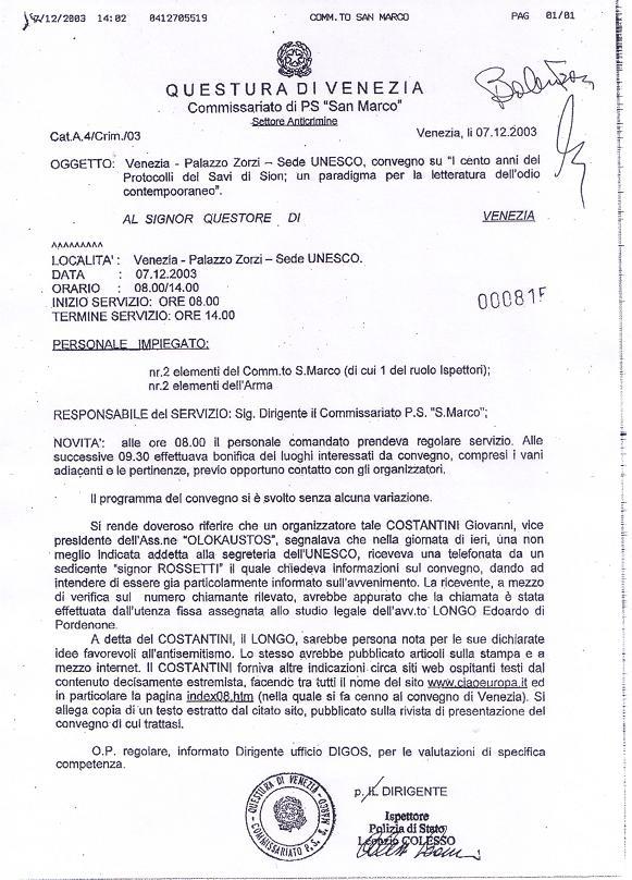 (un circolo culturale antisionista, 16-01-2004),18) “Ill.mo Dott. Casson, il Ministero dell’Interno – Direzione Centrale della Polizia di prevenzione, ha qui trasmesso una nota che riteniamo di Suo interesse e che trasmettiamo. Riporta il nome dell’avvocato Edoardo Longo e riguarda il giudizio su un convegno svoltosi a Venezia e organizzato dal “ centro Simon Wiesenthal, come sa sua Eccellenza. L’avvocato Longo taccia tale convegno di “coordinare una nuova campagna di terrore giudiziario sionista per soffocare il dissenso antimondialista..” e accusa “le toghe rosse della procura di Venezia, in particolare il pubblico ministero dott. Felice Casson” (circa tale particolare si è già riferito con nota del 16 dicembre scorso). F.to: IL DIRIGENTE LA DIGOS dott. V. Ciarambino. Venezia, 22 dicembre, 2003.”