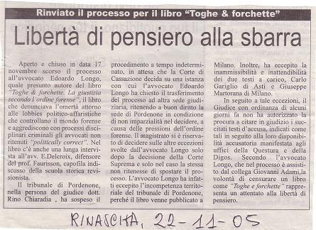 1) inviate al mio indirizzo i vostri commenti e giudizi su “il caso Longo”. verranno pubblicati, come una forma di petizione, in questo periodico aggiornamento (mi scuso con i tanti che ho tralasciato a causa del caos delle mie carte, ma rimedierò) e diffusi in Internet. Alzate la vostra voce di protesta contro la pulizia etnica del dissenso politico! Scrivete a: Edoardo Longo, e-mai: longo.e@libero.it - oppure all’indirizzo postale: avvocato Edoardo Longo, viale Libertà, 27, 33170 Pordenone – Italia -