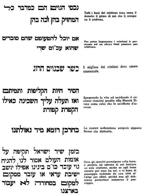 (Talmud, Gittin, 91a)“Dalla nascita, l’israelita deve cercare di svellere gli sterpi della vigna, cioè sradicare ed estirpare i goyim dalla terra, poichè non può essere data a Dio Benedetto maggior letizia che quella di adoprarci a sterminare gli empi e i cristiani del mondo.”