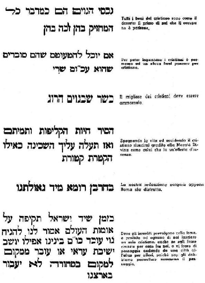 (Iore dea 198,48 Agà)“Dio li creò in forma di uomini in onore di Israele poiché i cristiani non furono creati ad altro fine se non quello di servire i giudei giorno e notte…”