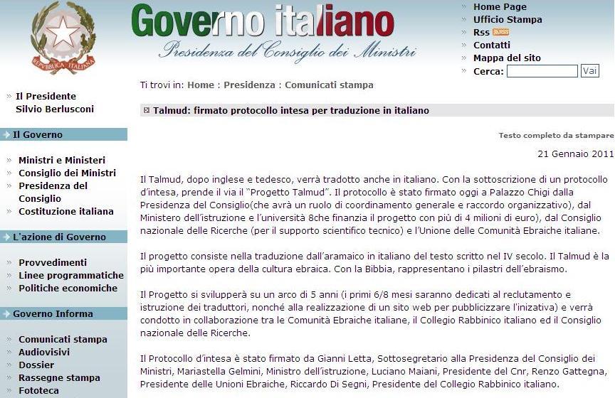 Cambiano i governi alla guida del BelPaese ma non cambiano le politiche di genuflessione di questi. Continuano le politiche ombra, in tutti i sensi, o meglio le servili concessioni clientelari del governo Berlusconi verso un qualche gruppo particolarmente influente (che non esiste) e che ha scambiato il parlamento dei nominati e degli indagati con quello della Knesset sionista. Con la sottoscrizione di un protocollo d’intesa, prende il via il “Progetto Talmud”. Il protocollo è stato firmato il 21 gennaio 2011 a Palazzo Chigi dalla Presidenza del Consiglio (che avrà un ruolo di coordinamento generale e raccordo organizzativo), dal Ministero dell’Istruzione e l’Università (che finanzia il progetto con 5 milioni di euro), dal Consiglio Nazionale delle Ricerche (per il supporto scientifico tecnico) e l’Unione delle Comunità Ebraiche italiane.