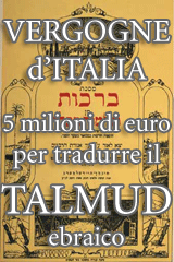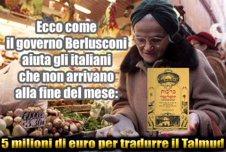 Queste sono soltanto alcune delle frasi contenute nel Talmud, delle quali i signori perbenisti e moralisti dei profumati salotti italioti, complici i media asserviti, fingono spudoratamente di non conoscerne i proverbiali contenuti razzisti e offensivi. Mancava soltanto la firma del ministro Mariastella Gelmini per partire. In un periodo di tagli all’istruzione però ha trovato la considerevole somma di 5 milioni di euro per la traduzione del testo ebraico. La traduzione in italiano, con il “patrocinio” (e ladrocinio) della Presidenza del Consiglio, sarà coordinata dal collegio rabbinico della capitale, e la firma della Gelmini non è stata un problema, proprio come aveva annunciato a novembre il rabbino capo di Roma Riccardo Di Segni: «Ci hanno promesso che arriverà a breve».Che vergogna! Agli italiani, invece, i basisti della mignottocrazia made in Arcore, paladini senzavergogna del predatore di prostitute minorenni e Capobanda del peggiore governo della storia patriottarda, con l’avallo di affaristi, tangentisti, mafiosi, palazzinari e soubrette tv in servizio permanente, hanno promesso lacrime e sangue.