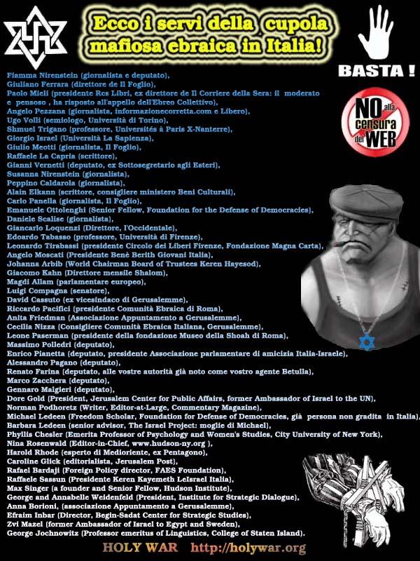 Eccovi ora i complici volonterosi dell'antisemita (perché ferocemente anti-araba) Fiamma Nirenstein. Questi signori vogliono mettere il bavaglio ad Internet, usando pagine come questa come miserabile preteso. Si tratta di una lista interessante e rivelatrice: