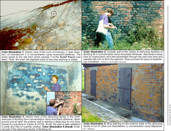 左下:カラー図版3:アウシュヴィッツ・ビルケナウ強制収容所建物5b北西部にある害虫駆除施設の内部。背景の右側の壁は、チクロンB(HCN)にさらされたために、鉄青によって深い青のしみがついている。左側の壁(のちに付け加えられた)は、白く、シアン化合物残余物が存在しない。(はめ込み写真):建物5bの害虫駆除施設の外壁。