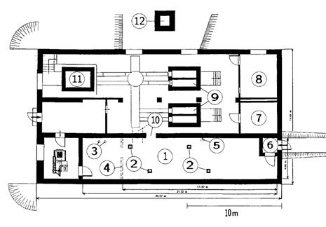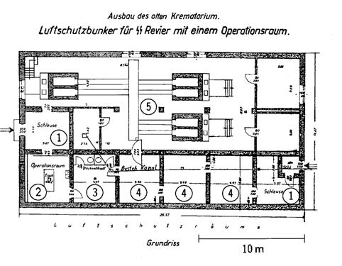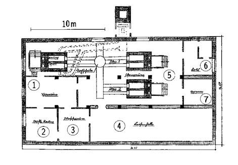 プレサック:焼却棟の大きさは、長さ36.57m、幅14.61m、高さ約3mでした。焼却棟の内部構成についてお話しすれば、①はVorraum(前室、玄関ホール、)、②はAufb[ahrungs]raum(配列室)、③はWaschraum(洗浄室)、④はLeichenhalle(死体安置室)、⑤はOfenraum(炉室)、⑥はKoks(石炭[室])、⑦はUrnen(骨[室])です。