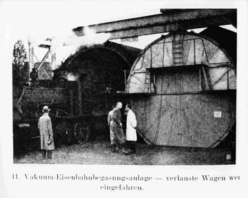 (害虫駆除用のシアン化水素)[113]の中で、すでに1910年に合衆国で行なわれていたシアン化水素をつかった船の燻蒸、殺菌駆除を受ける列車を収容するトンネル設備(図13参照)について報告している。公共の建物、兵舎、捕虜収容所、強制収容所でのチクロンBの使用についても、当時の文献で扱われている。[114]、[115]、[116]、[117]もちろん、チクロンB以外のガスを使った害虫駆除もあった。[118]、[119] チクロンBは、DDTやその後継剤に取って代わられるまで、戦後になっても重要な役割を果たした。[120]、[121]