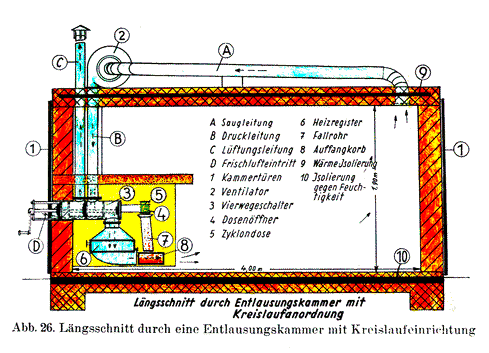 のちに、窓のない特別な気密設備が作られ、それは、効果的な暖房・換気装置を備えていた。また、室内のガスをもっと急速に循環させるために、空気循環システムを備えたものも作られた(いわゆる、デゲシュ循環手順、図14)。ここでは、チクロンBの缶は外部装置で開けられたので、作業員が危険にさらされることはもはやなかった。缶の底が自動的に穴を開けられ、調剤がかごに落ち、そこに送風機が温風を吹き込み、その結果、シアン化水素がすみやかに放出され、煙を運び去った。いわゆる循環手順を備えた施設は、高価な害虫駆除剤を節約するために、比較的小さく、数㎥であった。