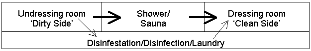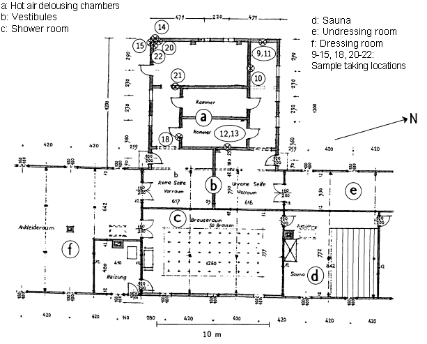 これらの専門設備は衛生施設群の一部であることが多かった。一般的に、この建物群は、次のように構成されていた。(図15参照)。[103]