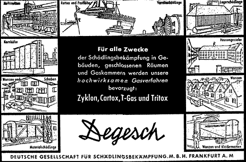 チクロンBはフランクフルトのデゲシュ[108]社が製造免許を持ち、製造していた。[109] 第二次大戦が終わるまで、チクロンBは、食糧倉庫、列車や船のような大型輸送機関での害虫やげっし動物の駆除にきわめて重要な役割を果した。[110]、[111] それはヨーロッパでもアメリカでもそうであった。[112]